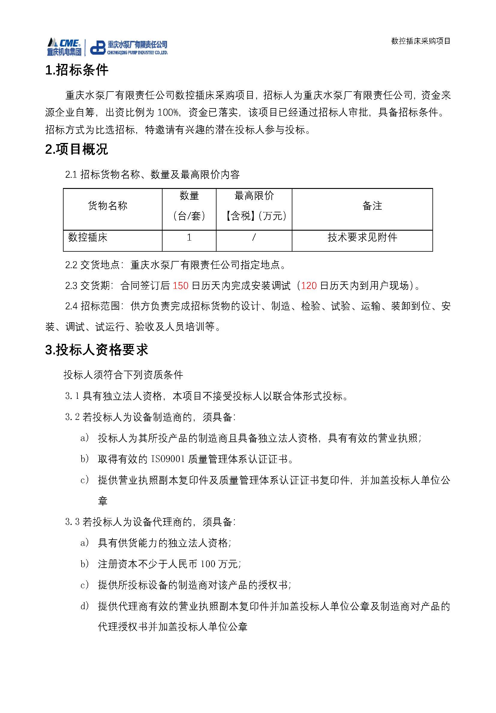 數(shù)控插床采購招標公告
